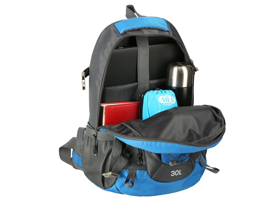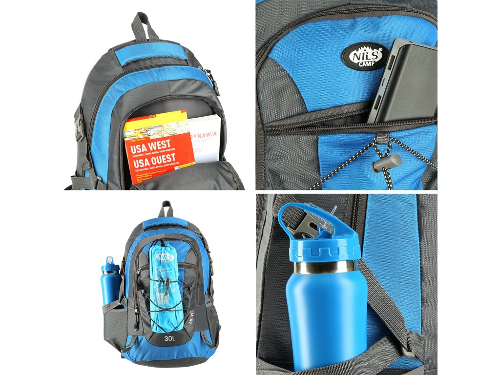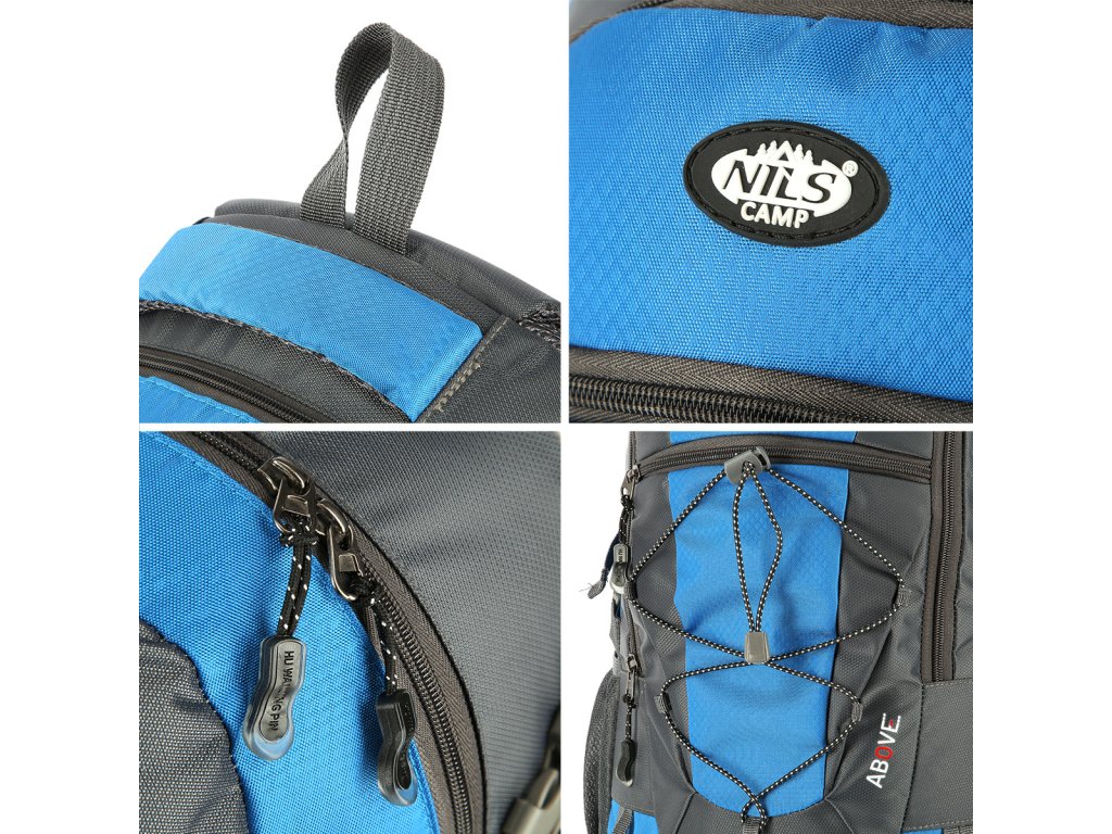 Na přední kapse je elastický pás s nastavitelnou délkou, který lze použít k upevnění velkých předmětů (cyklistická helma, boty, matrace do auta,...). Polstrovaná síťovaná záda jsou vybavena systémem NILS Vent, který zajišťuje cirkulaci vzduchu mezi batohem a zády a snižuje tak pocení. Pohodlné polstrované popruhy jsou délkově nastavitelné. Na horní straně najdeme pohodlné držadlo pro nošení batohu v ruce a poutko pro zavěšení batohu.