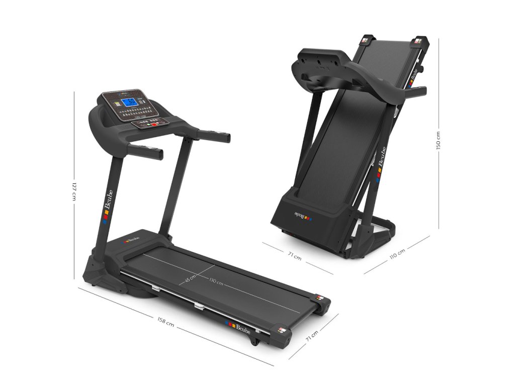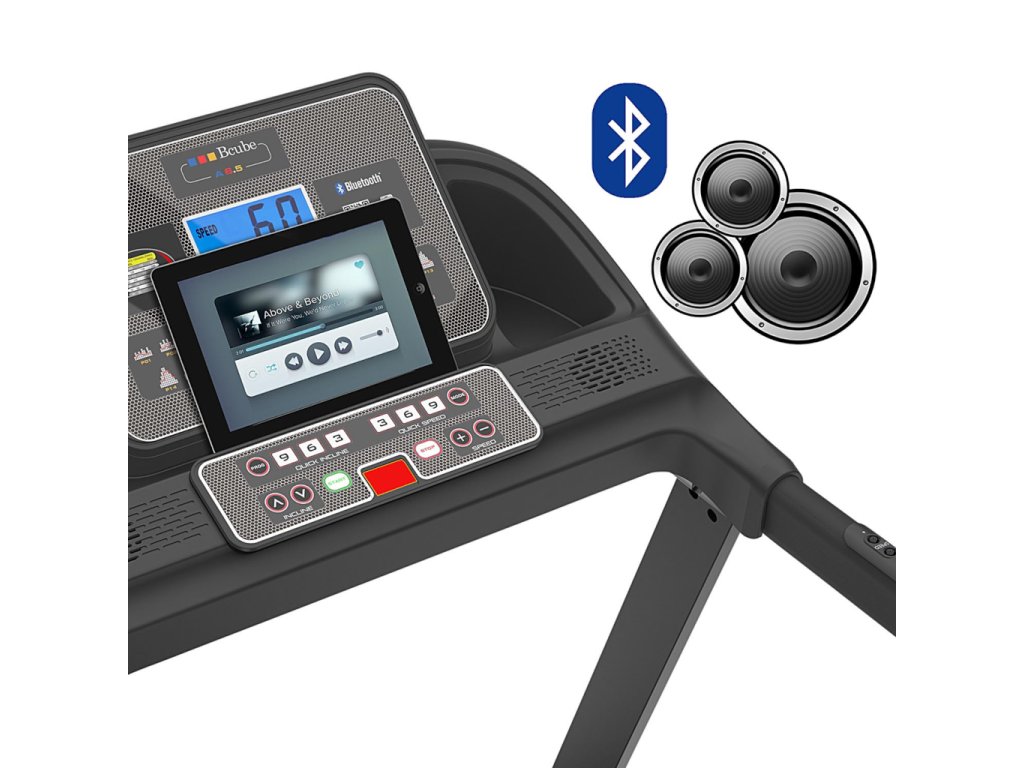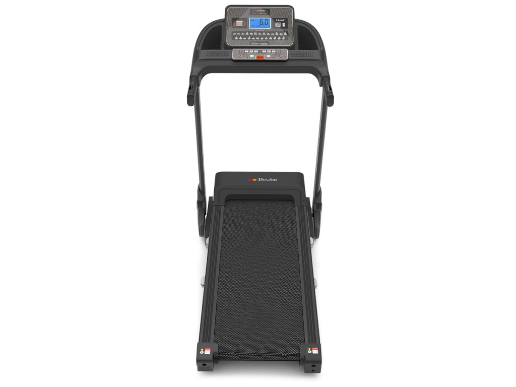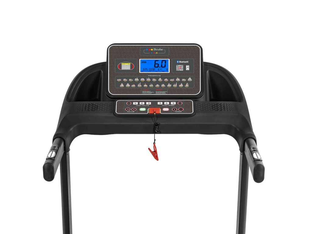 Výkonný 2 HP motor umožňuje dosáhnout rychlosti až 18 km/h, takže je vhodný pro rychlou chůzi, jogging i intenzivní běh. Elektrický sklon do 12% simuluje běh do kopce a zvyšuje náročnost tréninku. Běžecká plocha o rozměrech 45 × 130 cm poskytuje dostatek prostoru a díky dvojitému elastomerovému odpružení chrání klouby. Pás o tloušťce 1,6 mm zaručuje plynulý chod a dlouhou životnost. Pás nabízí 15 tréninkových programů, 12 rychlostních a 3 cílové programy, které se ovládají přes podsvícený LCD displej (11×6 cm). Rychlost i sklon lze měnit přímo z konzoly nebo madel. K dispozici je také program pro měření tělesného tuku a ruční senzor srdeční frekvence pro přesné sledování výkonu. Pro větší komfort je Bcube A 6.5 vybaven Bluetooth připojením, držákem na tablet a MP3 reproduktorem. Unese uživatele s hmotností do 120 kg. Díky elektrickému skládacímu systému a transportním kolečkům se snadno skladuje a přesouvá.