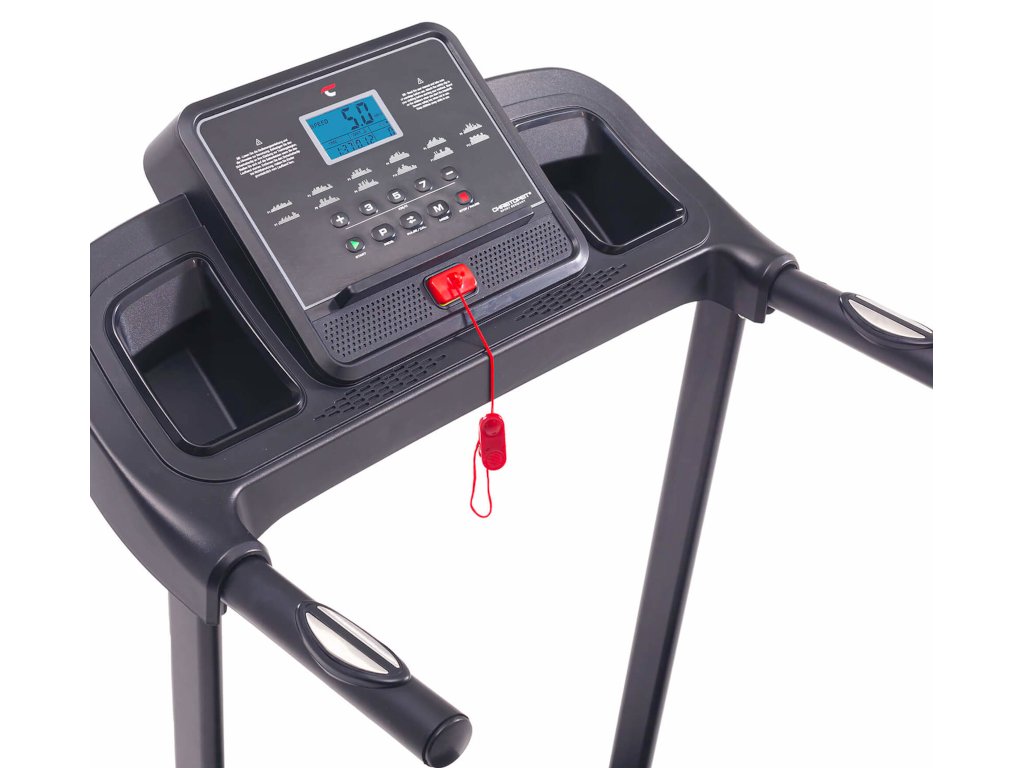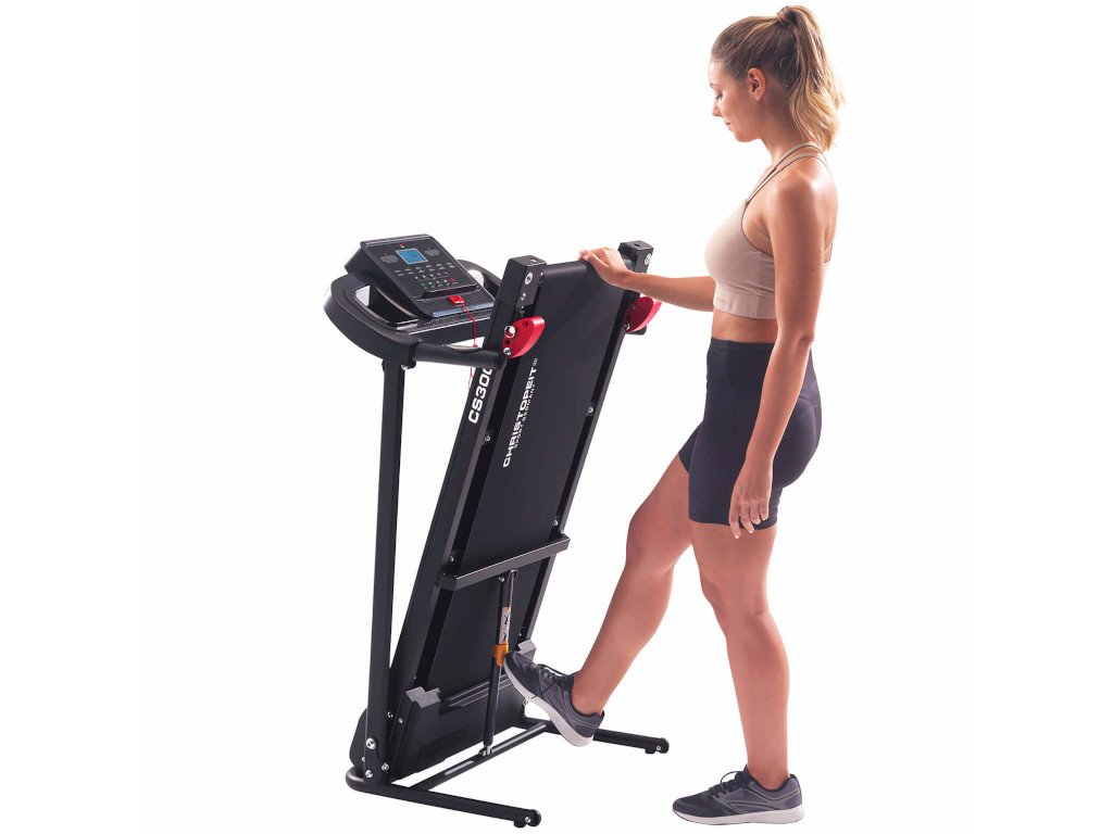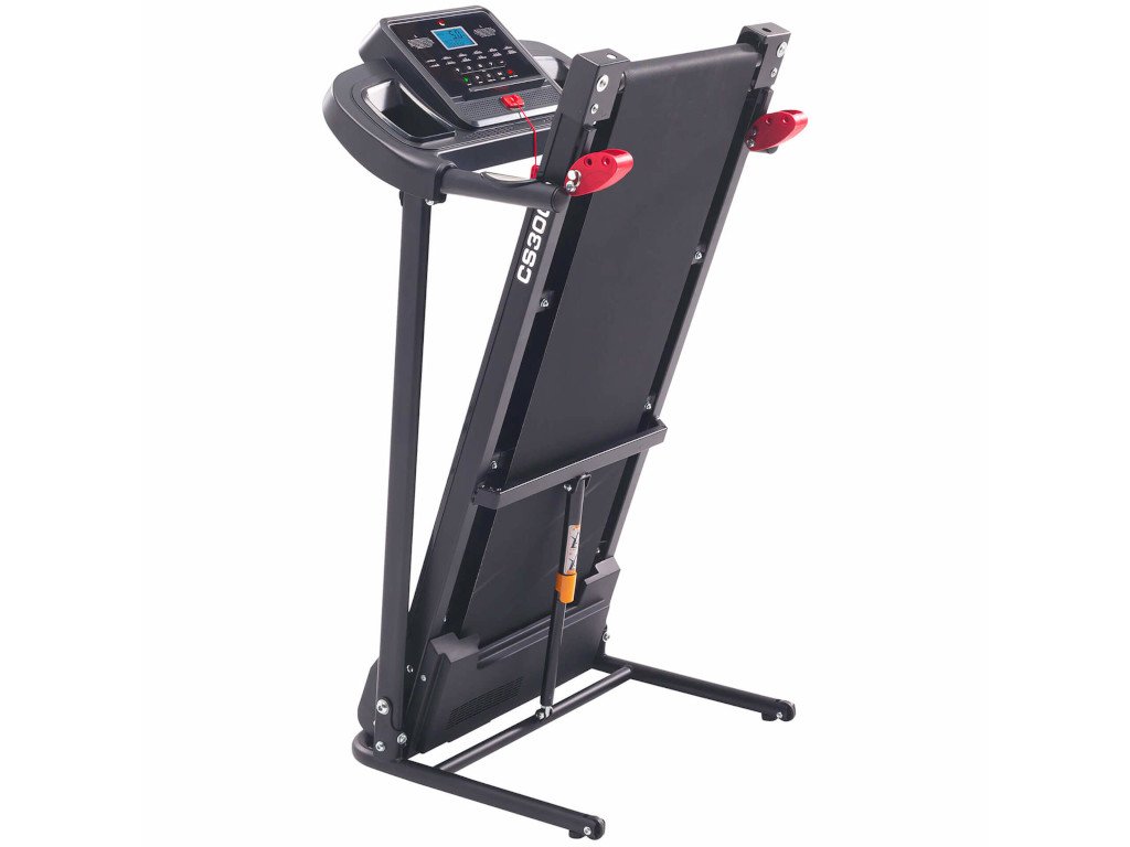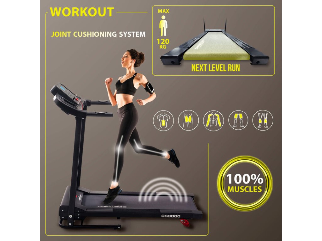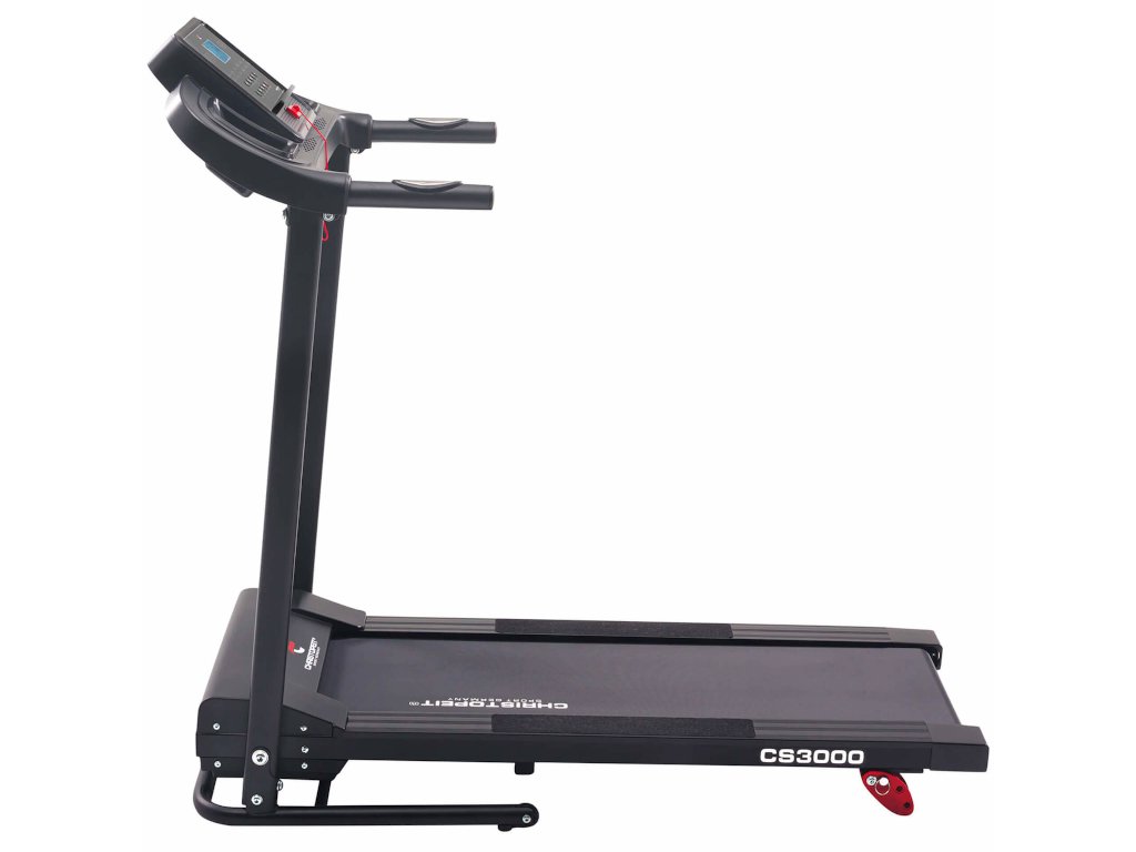Vibracemi tlumená běžecká plocha o rozměrech 100 x 34 cm bude šetřit při běhu vaše klouby. Chůze a běh vede ke zpevnění těla a celkovému zvýšení kondice, jakož i ke zvýšenému spalování tuků. Přehledný displej vám na první pohled zobrazí všechny relevantní hodnoty, jako je čas, vzdálenost, rychlost, přibližná spotřeba kalorií a puls. Komfortní počítač obsahuje 12 předdefinovaných tréninkových programů a 1 manuální program. Tlačítka přímé volby 3 až 7 km/h umožňují rychlý přístup k požadované rychlosti. Monitorování pulsu během tréninku je možné pomocí ručních snímačů pulsu integrovaných v rukojetích. Běžecký pás disponuje 3-stupňovým manuálně nastavitelným sklonem, díky čemuž můžete lépe trénovat běhy dovrchu nebo horskou turistiku. Běžecký pás CS 3000 lze rychle a jednoduše složit pomocí systému soft drop a přesunout na jakékoli místo pomocí integrovaných transportních koleček, aby se ušetřilo místo při skladování běžícího pásu.