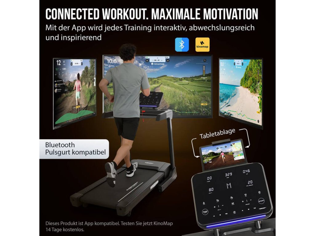 Pro ještě větší motivaci můžete pás připojit přes Bluetooth k aplikacím Christopher Connect nebo Kinomap a zažít interaktivní běžecké trasy po celém světě přímo z pohodlí domova.