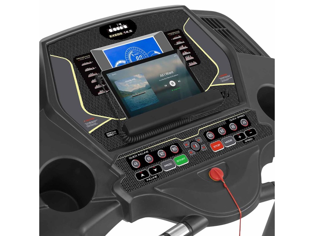 Konzole běžeckého pásu Exess14,5 je vybavena držákem na tablet, integrovanými reproduktory s MP3 zásuvkou a vstupem na USB klíč. Rozměry Exess 14,5 také zaručují výkonné cvičení i pro ty nejtrénovanější. Běžecká plocha má rozměry 58x150 cm a motor o výkonu 3,5 HP vám umožní dosáhnout rychlosti 22 km/h. Běžecká plocha, odpružená 8 elastomery, lze elektricky naklonit až o 20 %.