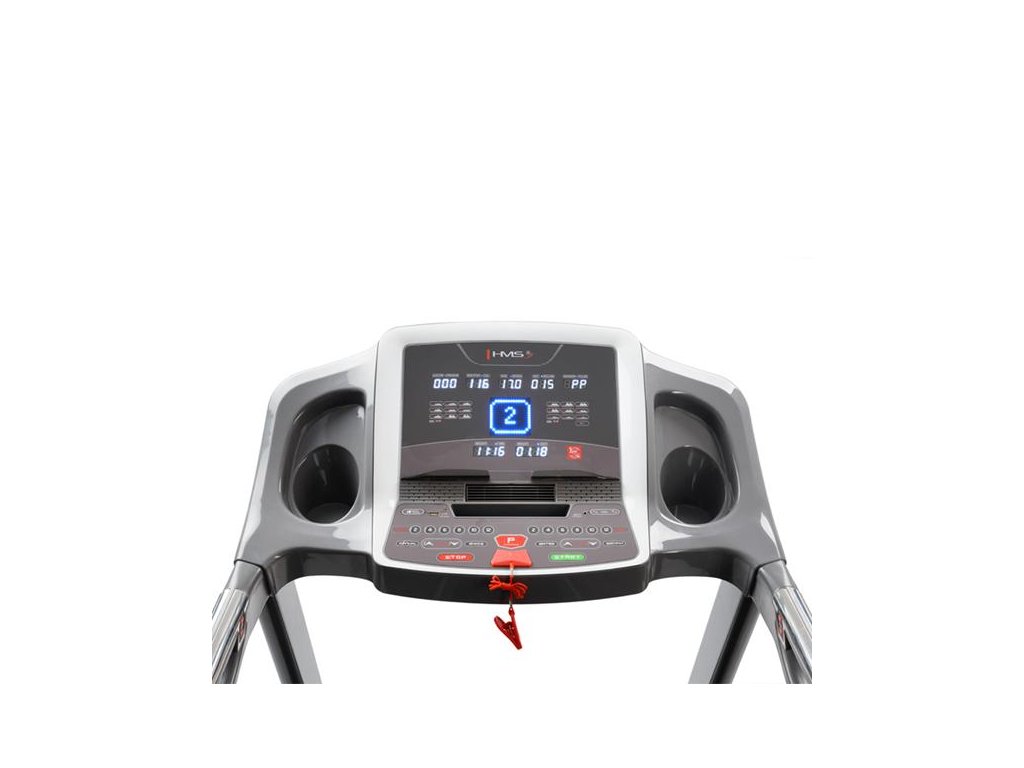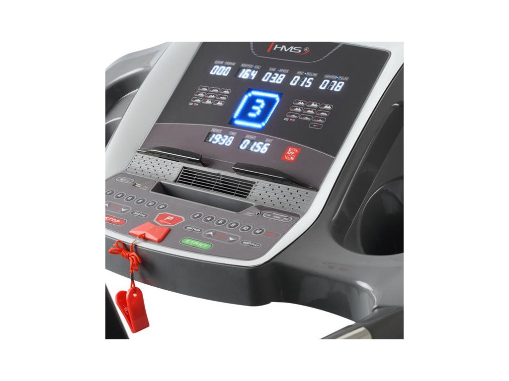 Elektrický běžecký pás HMS je kvalitní, stabilní běžecký pás uzpůsobený k intenzivnímu domácímu tréninku. Součástí pásu je počítač s dotykovým LCD displejem s možností připojení mobilního zařízení. Na displeji můžete během cvičení sledovat všechny potřebné údaje jako jsou čas, vzdálenost, rychlost, tepová frekvence a spálené kalorie. Běžecká plocha je vybavena mechanismem automatického nastavení sklonu. Pro usnadnění oceníte tlačítka rychlého výběru nastavení, které umožňují provést změnu bez přerušování tréninku. Výhodou je i systém skládání a rozkládání běžeckého pásu. Díky úspoře prostoru se vejde i do menších prostorů.