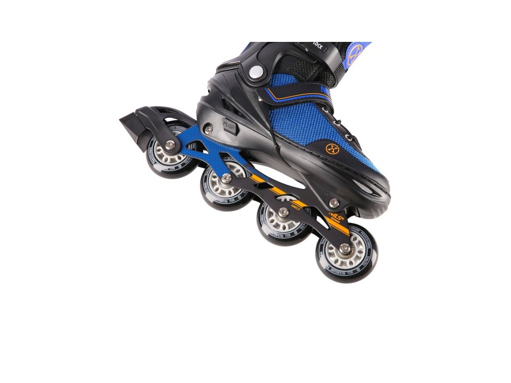 Hliníkový podvozek je osazen PU kolečky o tvrdosti 82A, která představují ideální kompromis mezi rychlostí, odolností a pohodlím. Kola jsou vybavena ložisky ABEC 7, která zajišťují svižnou a plynulou jízdu. Skelet brusle je vyroben z polypropylenu, který dobře přenáší energii z odrazu na kolečka a vydrží i případný pád. Pohodlná, poloměkká bota je vyrobena z kombinace EVA a pěny s vysokou hustotou. Prodyšná membrána chrání před případnou vlhkostí. Vnitřní bota nemá krytou špičku, takže dobře větrá a noha se méně potí. Zapínání je řešeno klasickou trojkombinací - šněrování, proužek na suchý zip a dvoudílná přezka. Pravá brusle je vybavena brzdou.