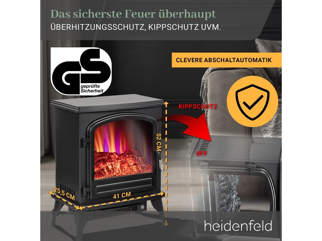 Samozřejmě, u elektrického krbu není skutečný oheň. Bezpečnost je však na prvním místě! Za tímto účelem je v elektrickém krbu Heidenfeld EK100 zabudována ochrana proti přehřátí. Navíc se díky ochraně proti převrácení automaticky vypne, pokud se nakloní.