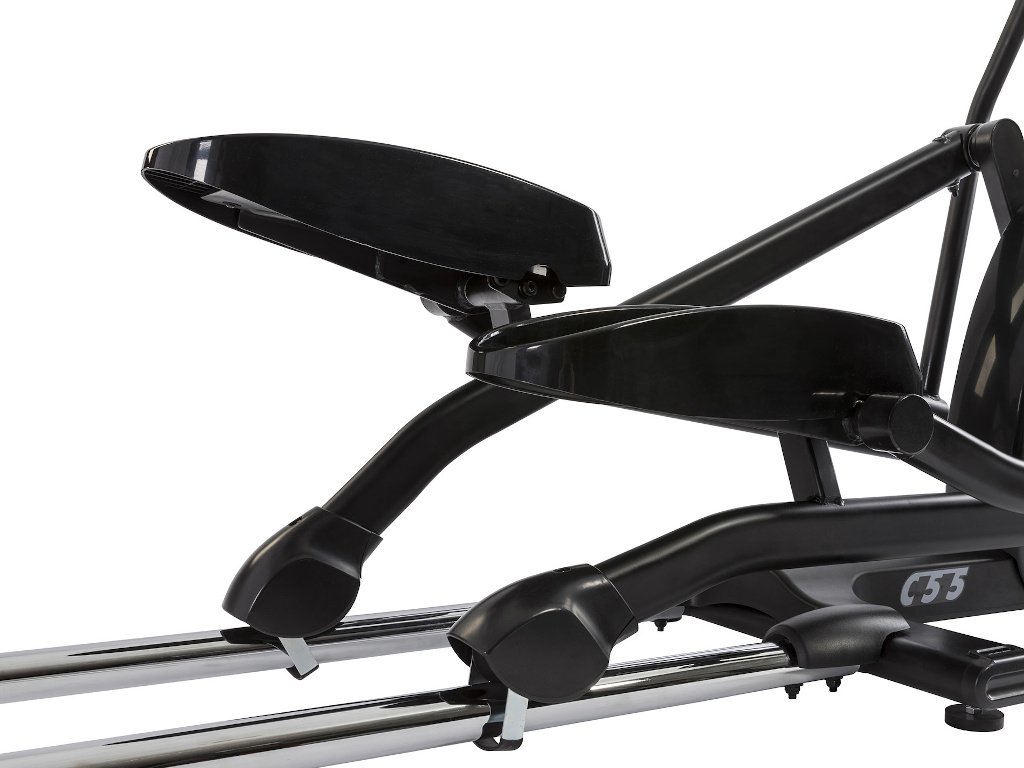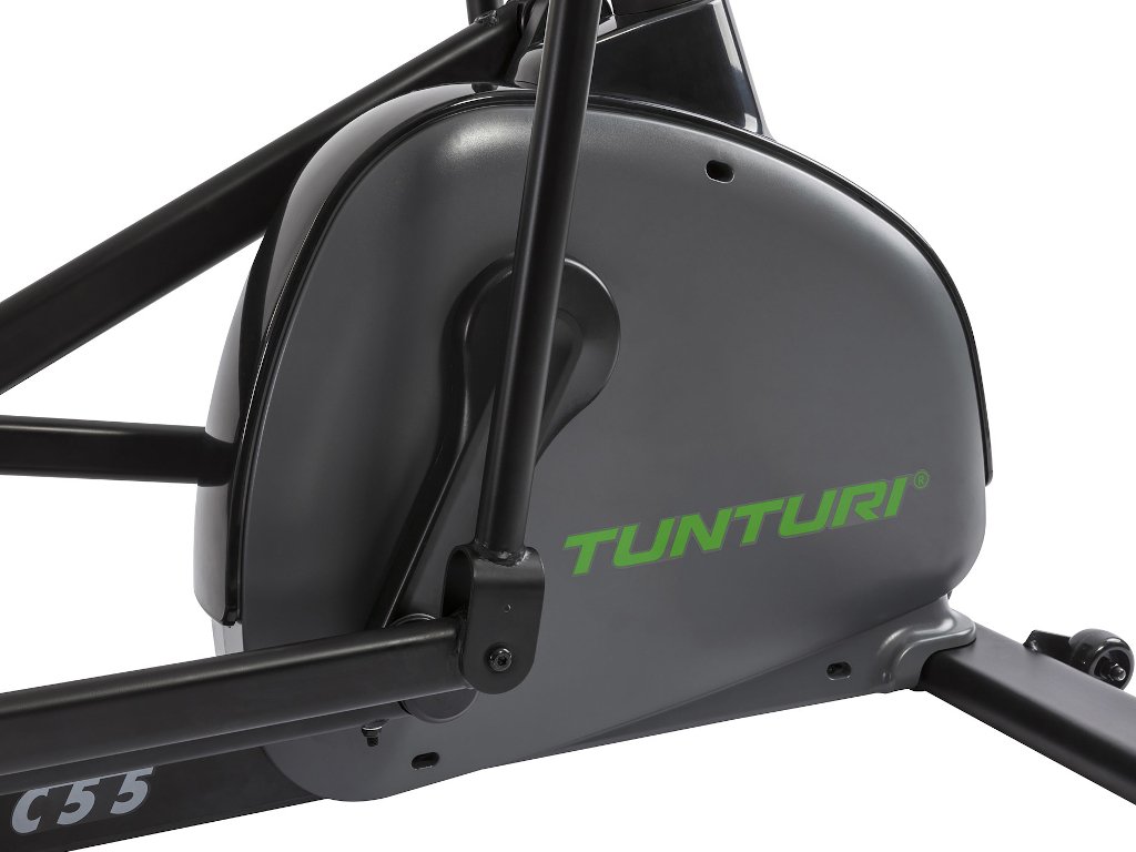 Stroj disponuje standardně dlouhým krokem o délce 50 cm a díky optimální ergonomii je zaručen pohodlný a správný pohyb jak drobným, tak vyšším postavám. Stabilní a masivní konstrukce spolu s kvalitními komponenty zaručuje dlouhou životnost stroje a předurčuje model pro pravidelný trénink. Díky kalibrovanému systému setrvačníku o celkové hmotnosti 32 kg a moderní magnetickou brzdou má TUNTURI Performance C55 F komfortní, plynulý a naprosto tichý chod i při větších zátěžích. Tento model je kompletně na ložiskách včetně kloubových spojů.
