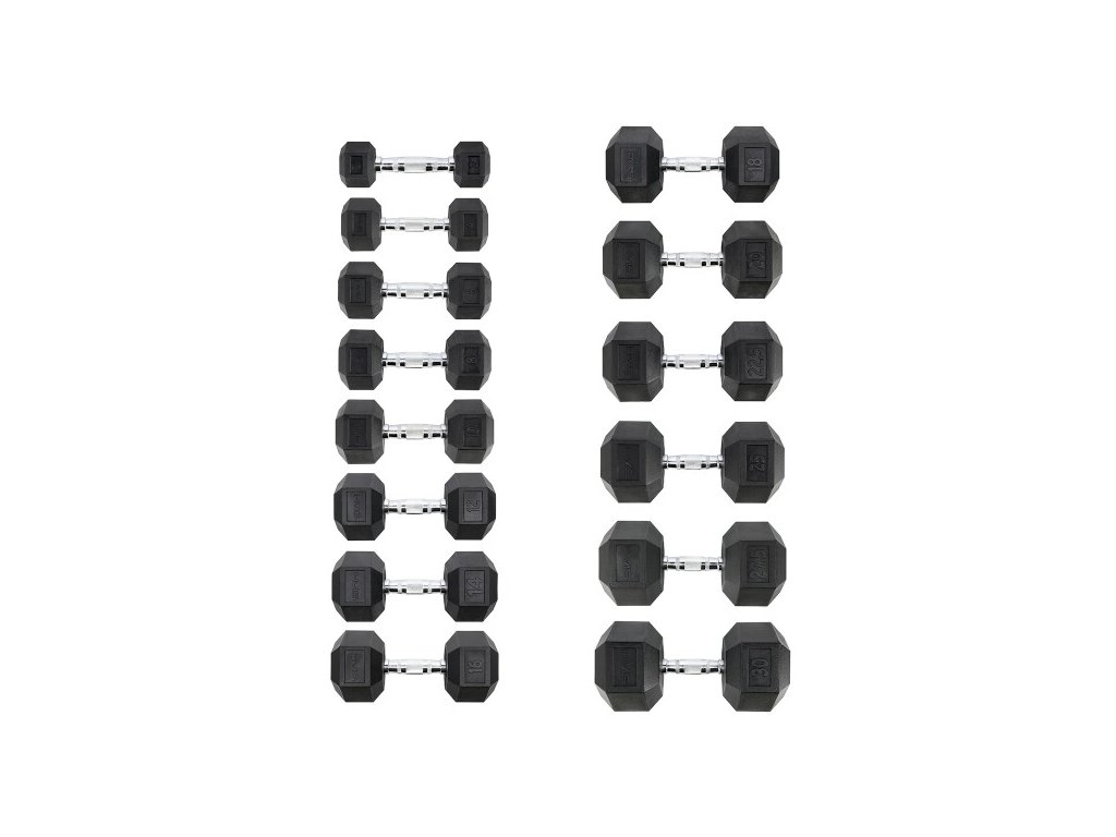 Šestihranný tvar zamezuje nechtěnému pohybu činky při jejím odložení a pogumování prodlužuje její životnost. Chromový úchop je opatřen rádlováním pro jistější držení.