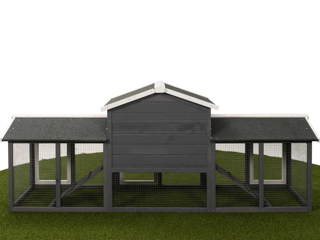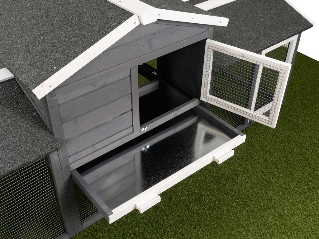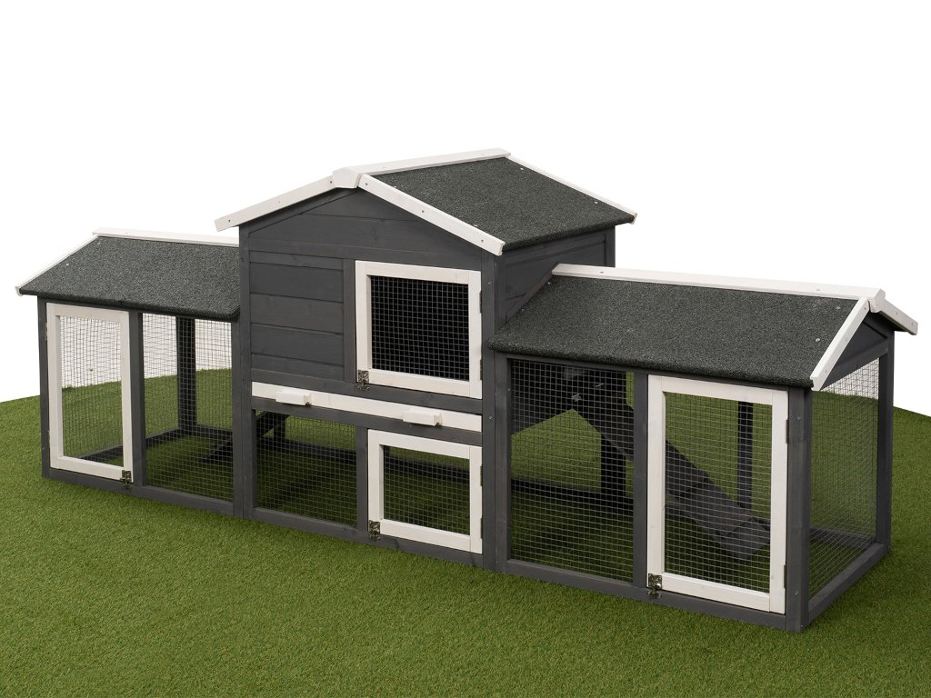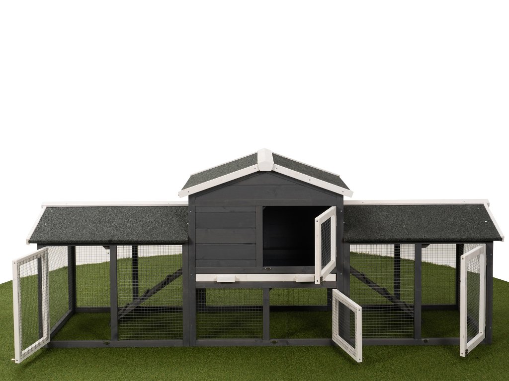 Každou chvíli je třeba vyčistit králíkárnu. Troje velká dvířka velmi pomáhají, protože přes ně se snadno dostanete i do nejvzdálenějších koutů. Například, pokud se vaše králíky skrývají před vyšetřováním, máte možnost otevřít králíkárnu na dvou úrovních. Tímto způsobem se také dostanete ke svým králíkům bez námahy.