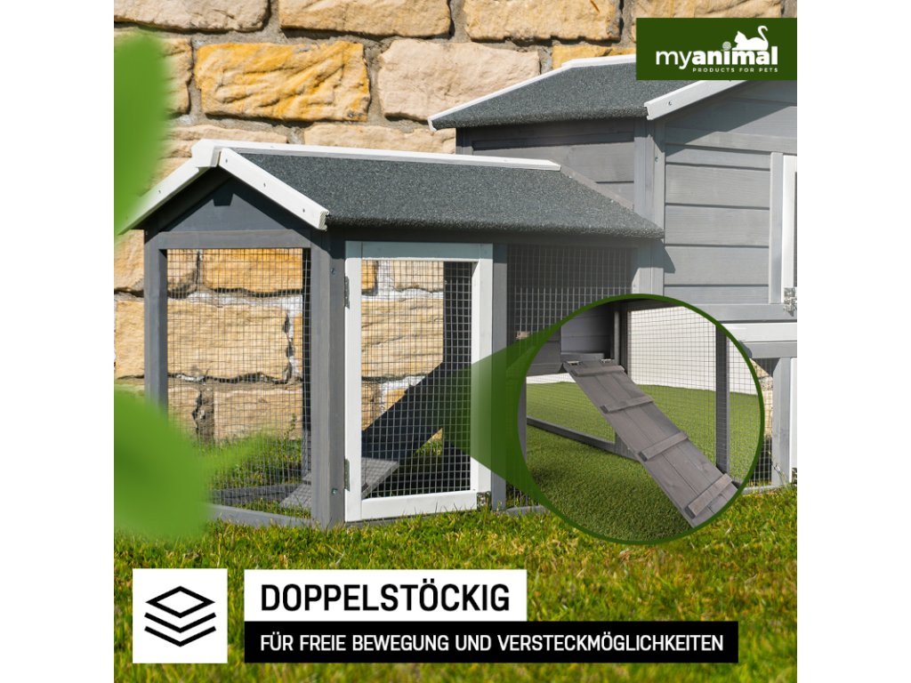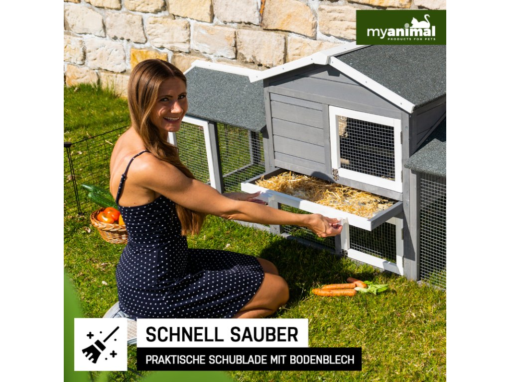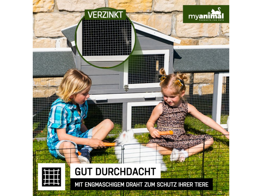 Touha mít vlastního domácího mazlíčka je sen každého dítěte. Chcete se mazlit s malým chlupatým čtyřnohým kamarádem, poskytovat mu jídlo a čistotu – to je velmi jednoduché. Králíkárna MyAnimal MH-03 2.0 je nejen stabilní a vyrobená z kvalitních materiálů, ale nabízí dokonce dvě úrovně, na kterých se mohou domácí zvířata dovádět. Především můžete svým králíkům dopřát pohodlný výběh venku, aniž byste je museli neustále sledovat.