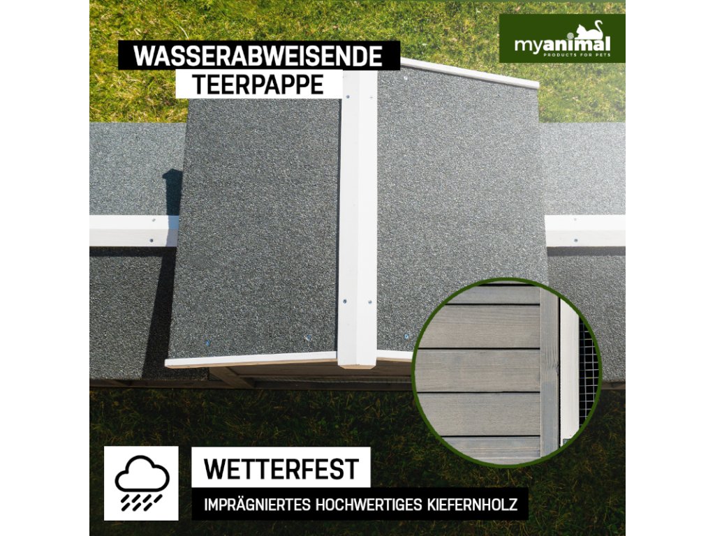Ne nadarmo klademe velký důraz na kvalitu – jak z hlediska materiálu, tak i zpracování: borové dřevo je čistě opracované a pečlivě impregnované. Díky tomu je králíkárna MyAnimal MH-03 2.0 extrémně odolná vůči povětrnostním vlivům, protože vaše králíci potřebují bezpečnost a ochranu, když jsou venku. Tak splňujeme standardy kvality – a ty jsou v zájmu zvířat velmi vysoké.