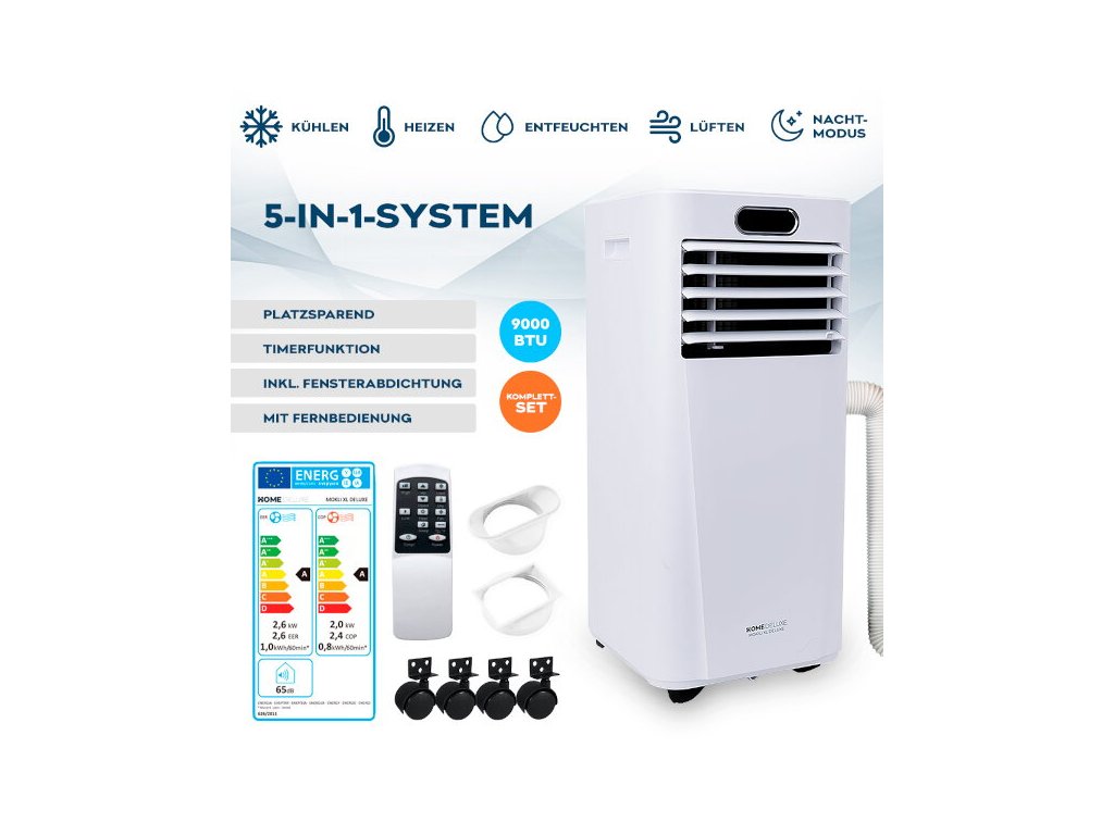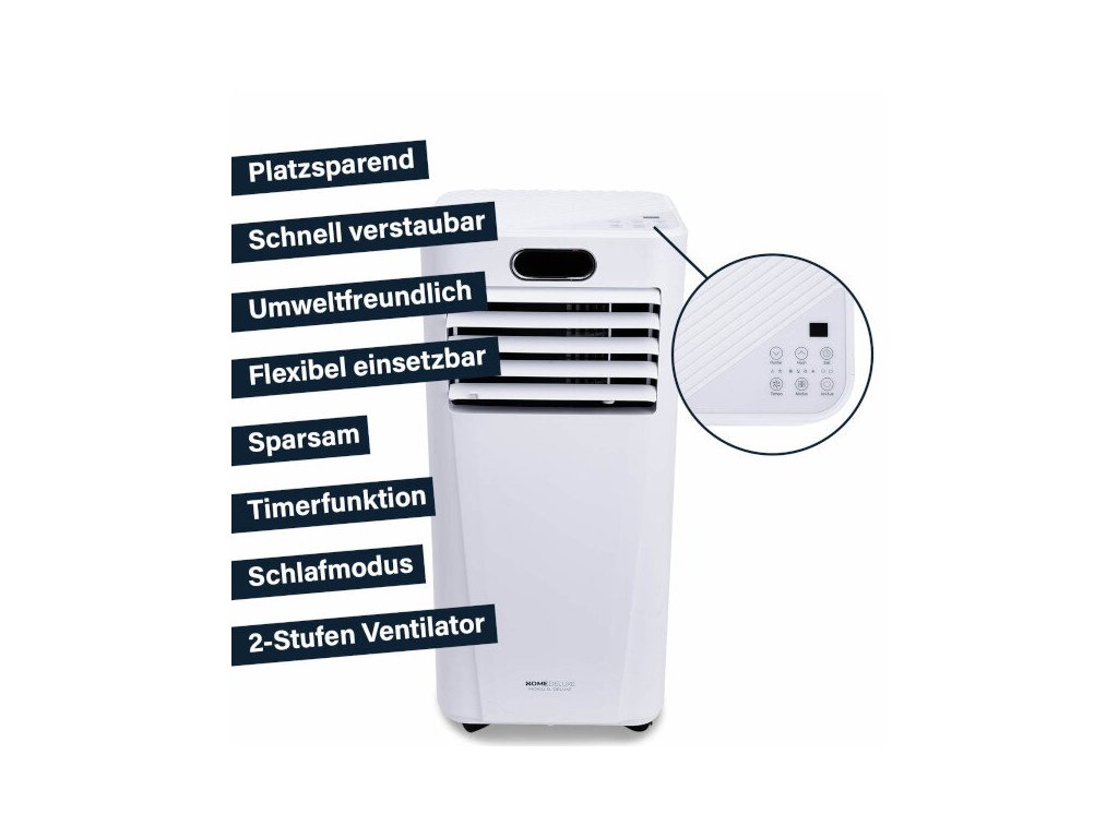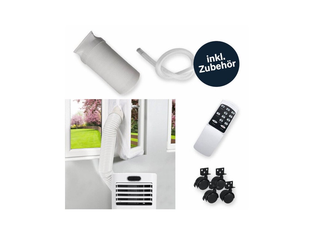 Mobilitu zařízení zajišťují pohyblivá kolečka, takže je vždy připraveno k použití tam, kde je nejvíce zapotřebí. Díky své kompaktnosti je klimatizace prostorově úsporná a snadno skladovatelná. Flexibilní 150 cm hadice na vyfukovaný vzduch se přizpůsobí jakémukoli prostředí. Klimatizace nabízí funkce odvlhčování a časovače, což umožňuje inteligentní regulaci teploty, např. i během noci. Integrované filtry zabezpečují čištění vzduchu.