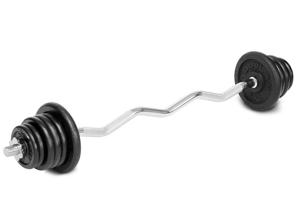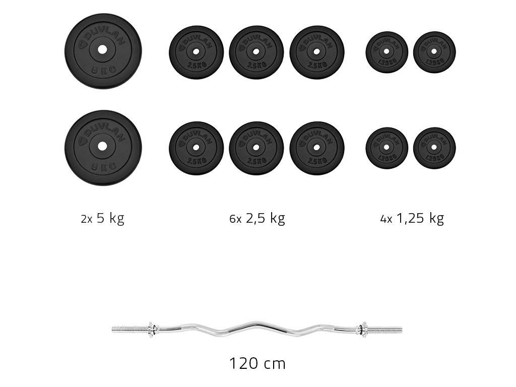 Nakládací ocelový set DUVLAN 37 kg představuje skvělý start do cvičení. Sestává z jedné vzpěračské tyče ohýbané 120 cm a ocelových kotoučů. Hřídel činky je vyroben z kovového materiálu a na obou koncích vybaven závity pro bezpečnostní objímku. Díky širokým možnostem je ideální pro posilování horních končetin a horní části trupu.