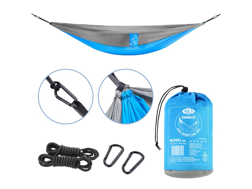 Houpací síť Nils Camp NC9092 modrá se dodává v praktickém přepravním pouzdře spolu se dvěma šňůrami na zavěšení sítě mezi 2 body, nejčastěji mezi dva stromy. Pro úsporu místa a hmotnosti je každý konec sítě vybaven 1 závěsným lanem, takže si do houpací sítě lehnete jako do "sáčku", toto řešení zabraňuje vypadnutí ze sítě a model NC9092 je díky němu vhodný ke spaní.