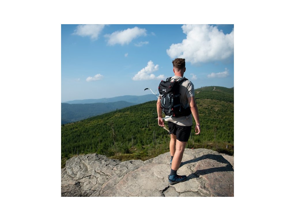 Na přezce hrudního popruhu je integrovaná záchranná píšťalka, která zvyšuje bezpečnost uživatele. Přídaná poutka umožňují připevnit například trekové hole nebo jiné příslušenství. Batoh má také dvě boční kapsy ze síťoviny a kapsy na zip na bederním pásu, ideální na telefon nebo jiné drobnosti.