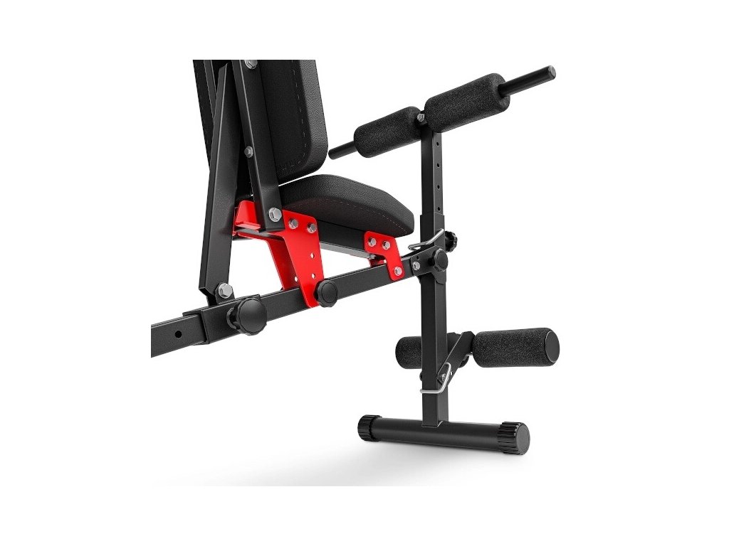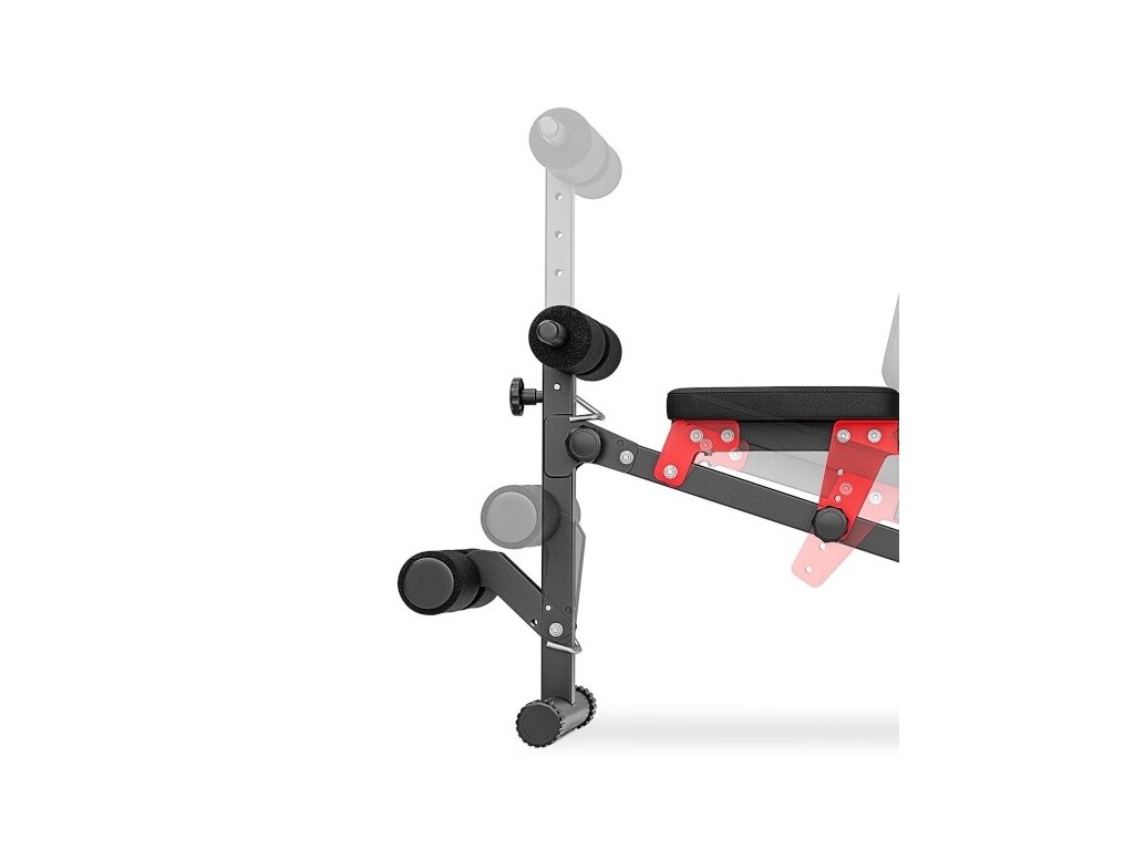 Praktickou stránkou lavice MARBO MH-L111 2.0 je regulácia chrbtovej opierky, ktorá sa vykonáva pomocou skrutiek s plastovým, ergonomickým úchytom. Polstrovanie je ošetrené dvojitými švami pre maximálnu pevnosť. V najnamáhanejšom mieste je opierka pretiahnutá druhou vrstvou kože s logom MARBO Sport.