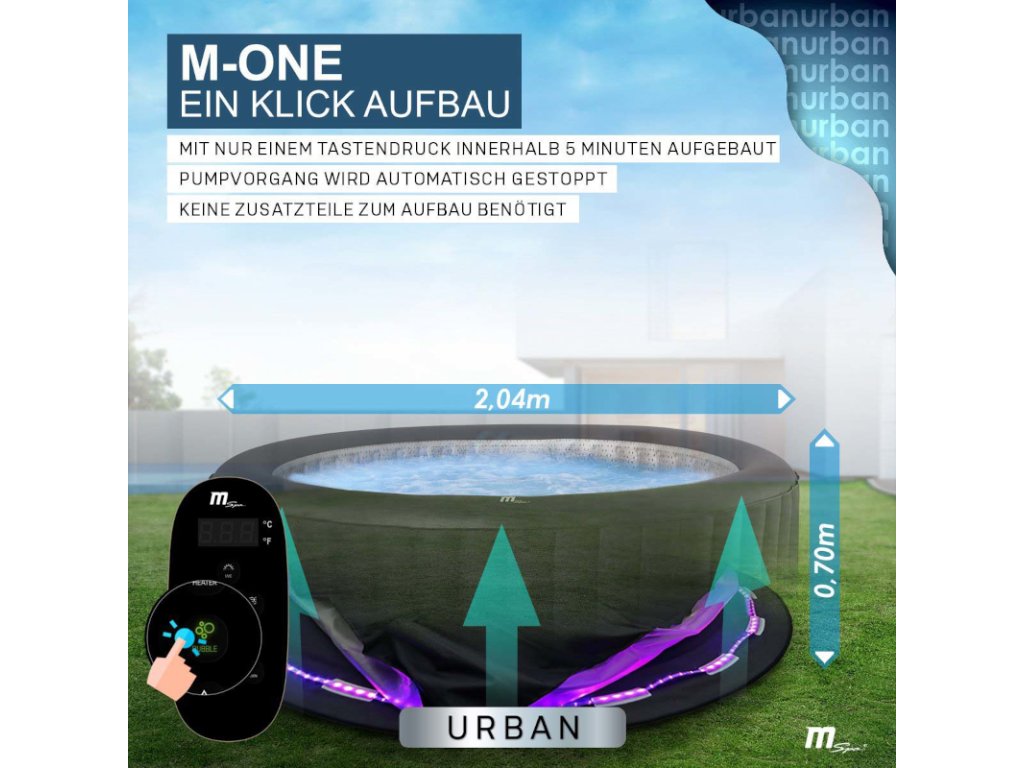 Vířivka Miweba MSpa Aurora předvádí maximální komfort při montáži. Díky systému M-ONE je vířivka nejen nafukovací: dá se nafouknout obzvláště rychle. Celý proces je dokončen za pouhých pět minut. Jednoduše zapojte napájení a poté stiskněte současně tlačítka „BUBBLE“ a „UP“. Integrovaný manometr během nafukování monitoruje tlak vzduchu a zastaví přívod vzduchu, jakmile je dosaženo optimální úrovně tlaku a požitek může začít.