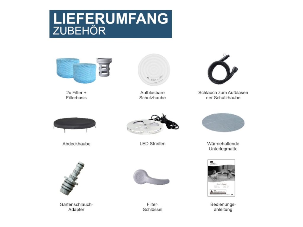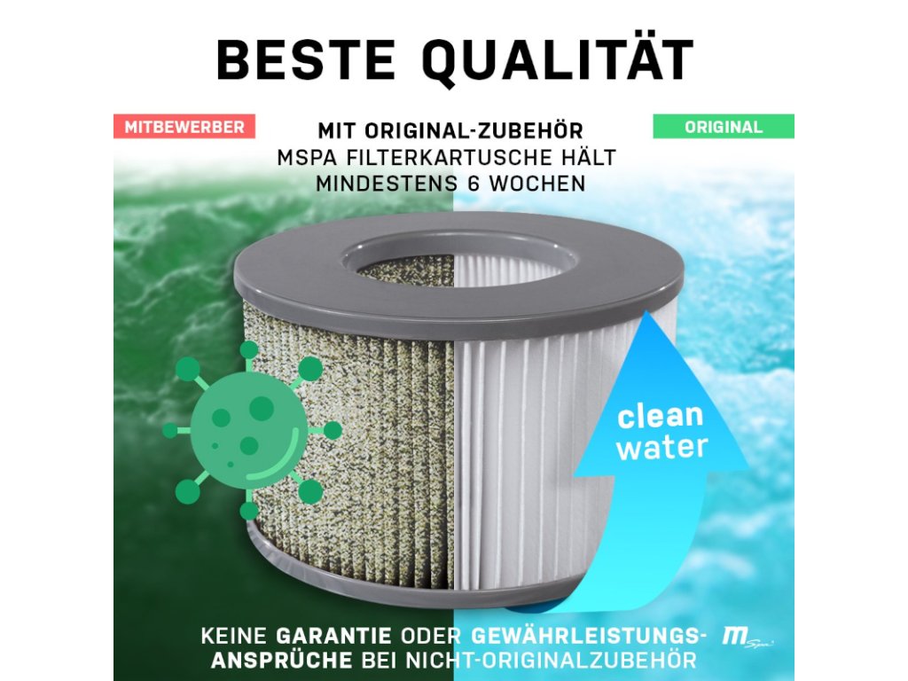 S našimi vířivkami si užijete spoustu zábavy na dlouhou dobu. Jistotu si však můžete být jen tehdy, vsadíte-li na originální příslušenství. Nezapomínejte, že neoriginální díly a příslušenství nejsou testovány ani schváleny společností Mspa a že Miweba nemůže posoudit jejich vhodnost a bezpečnost pro samotné díly, ani vliv na funkčnost a spolehlivost, jako je tepelná ochrana nebo účinnost filtrace. Poškození způsobené použitím neoriginálního příslušenství, jako jsou filtry, kryty, tepelné ochranné rohože nebo nesprávným použitím, je vyloučeno ze záruky.