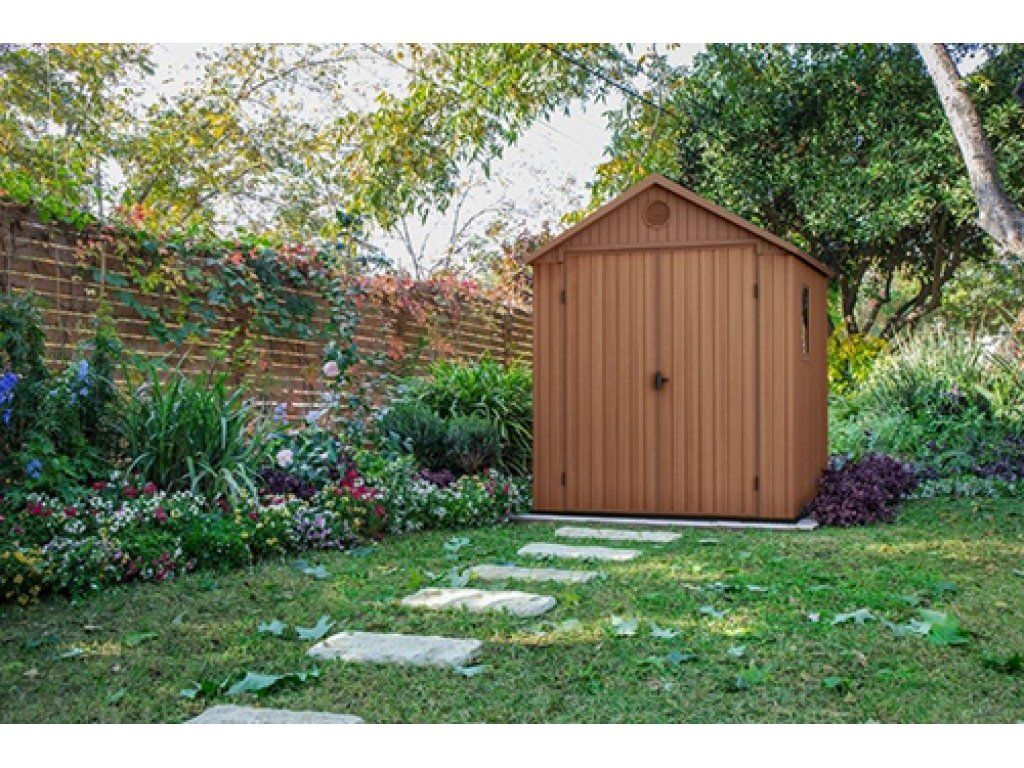 Střecha a stěna produktu jsou vyrobeny z vysoce kvalitních materiálů odolných vůči povětrnostním vlivům, pronikání vlhkosti a mechanickému poškození. Velký interiér umožňuje ukládat všechny druhy zahradního příslušenství a vybavení. Povrchová struktura imituje dřevo.